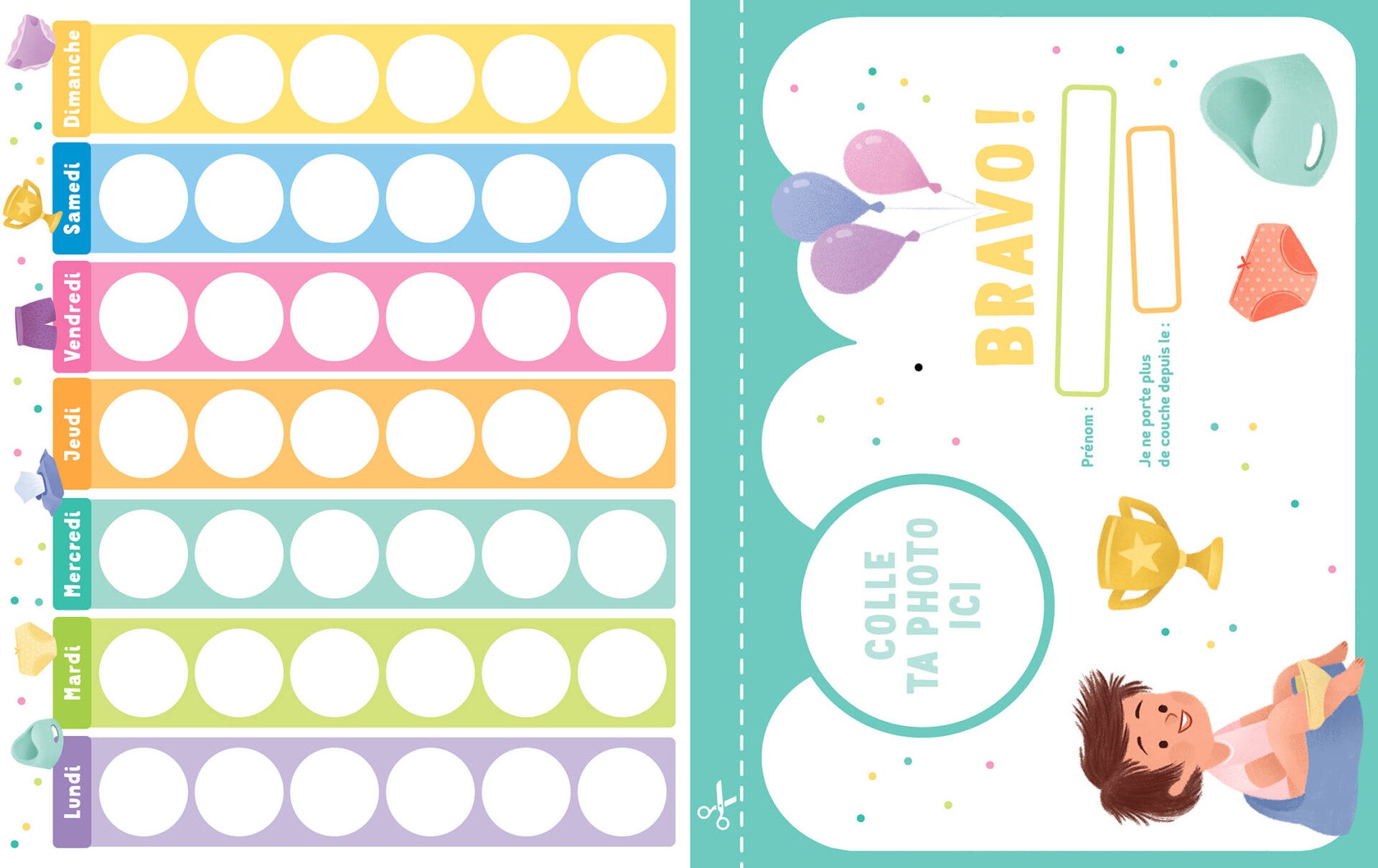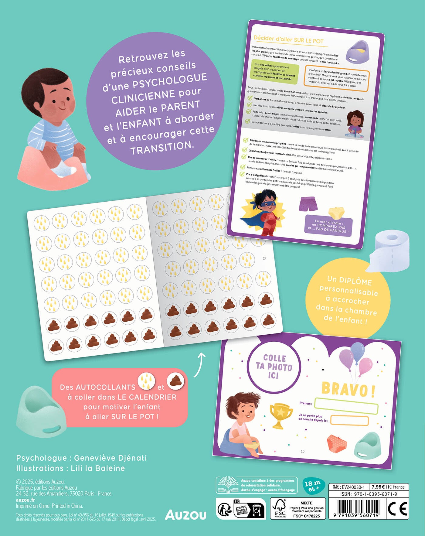 Un calendrier à remplir avec des autocollants pipi et caca pour aider et faciliter l'utilisation du pot. Des conseils d'une pédopsychiatre à l'usage des parents et un super diplôme complètent ce manuel prêt à l'emploi !