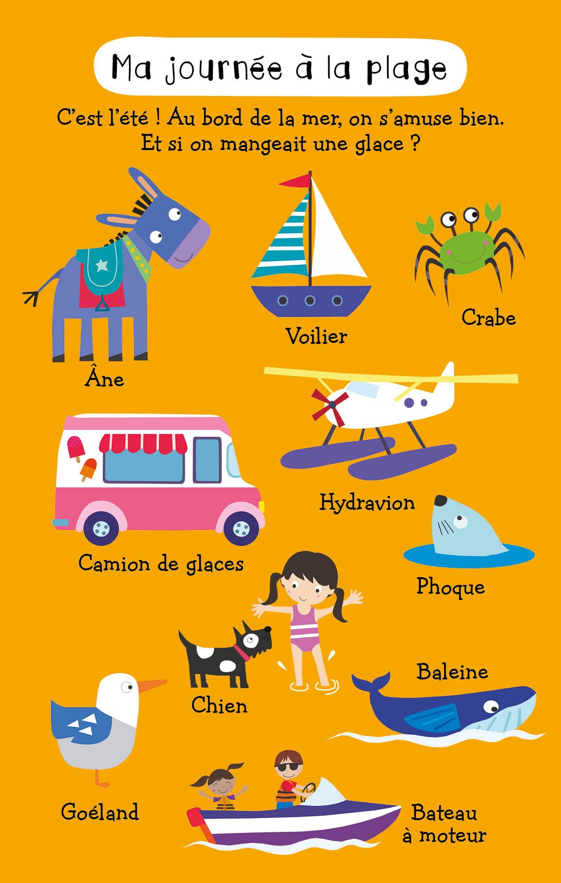 Ce livre sonore grand format propose de découvrir 5 lieux : la ville, la plage, la montagne, le parc, la ferme, avec 50 sons associés. Les illustrations à chercher sont de grande taille pour favoriser l’attention. Un livre joyeux et coloré pour exercer la mémoire visuelle et auditive des jeunes enfants.