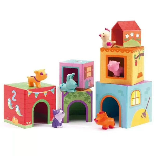 Les cubes empilables Topanifarm permettent de construire de jolies tours et d'inventer de magnifiques histoires avec des animaux. Dès 18 mois.